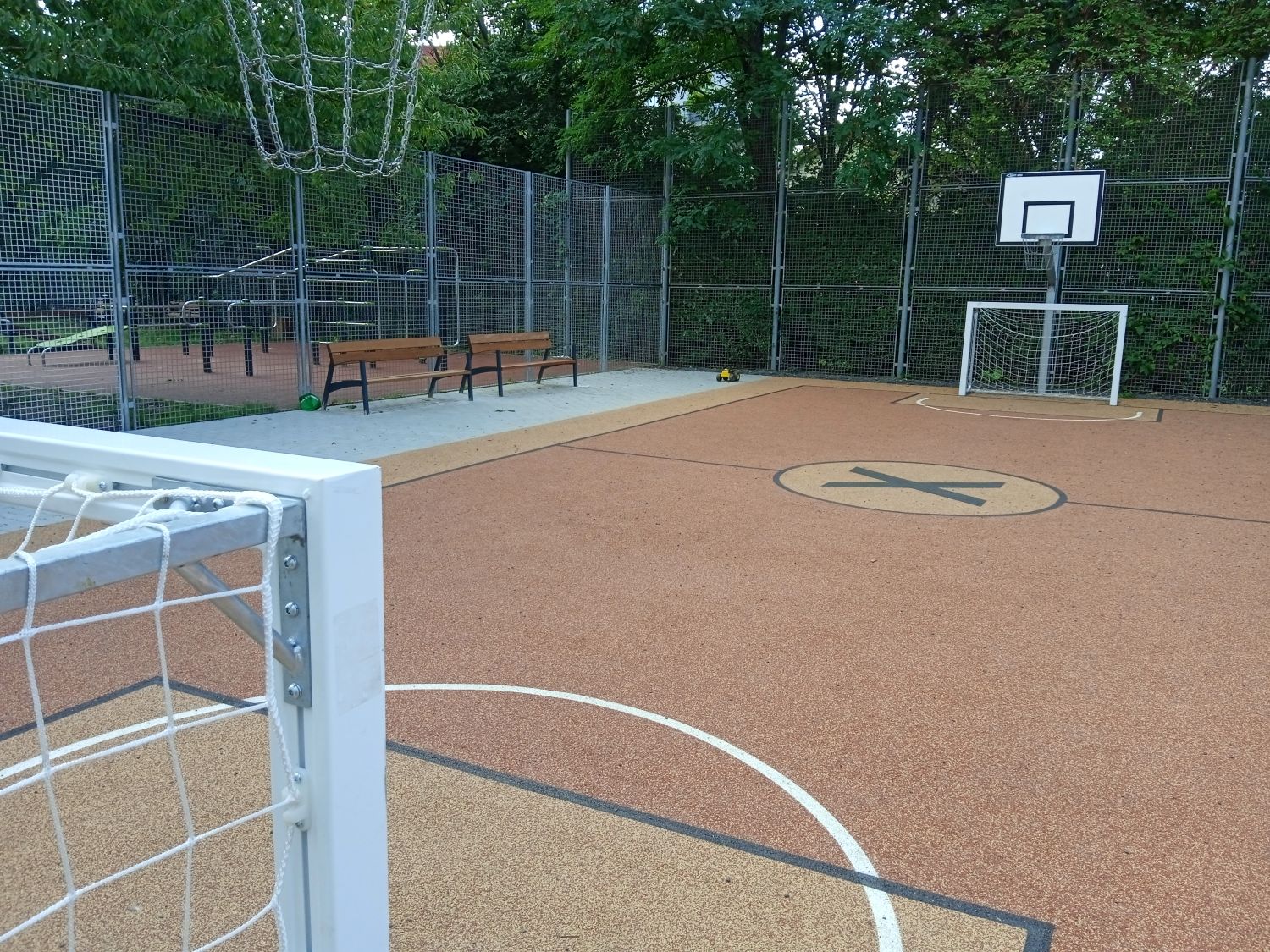 Realizace víceúčelového hřiště na basketbal a kopanou pro malé návštěvníky. Nový pryžový povrch. Zvýšené areálové oplocení. Nový mobiliář.